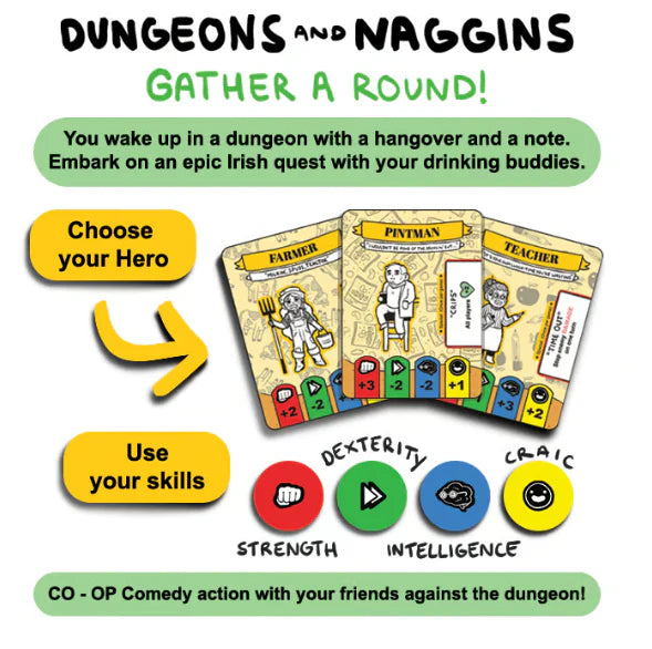 Dungeons and Naggins is a co-op board game with an Irish comedy theme, and optional drinking game rules. It's great craic and it's easy for non-gamers.